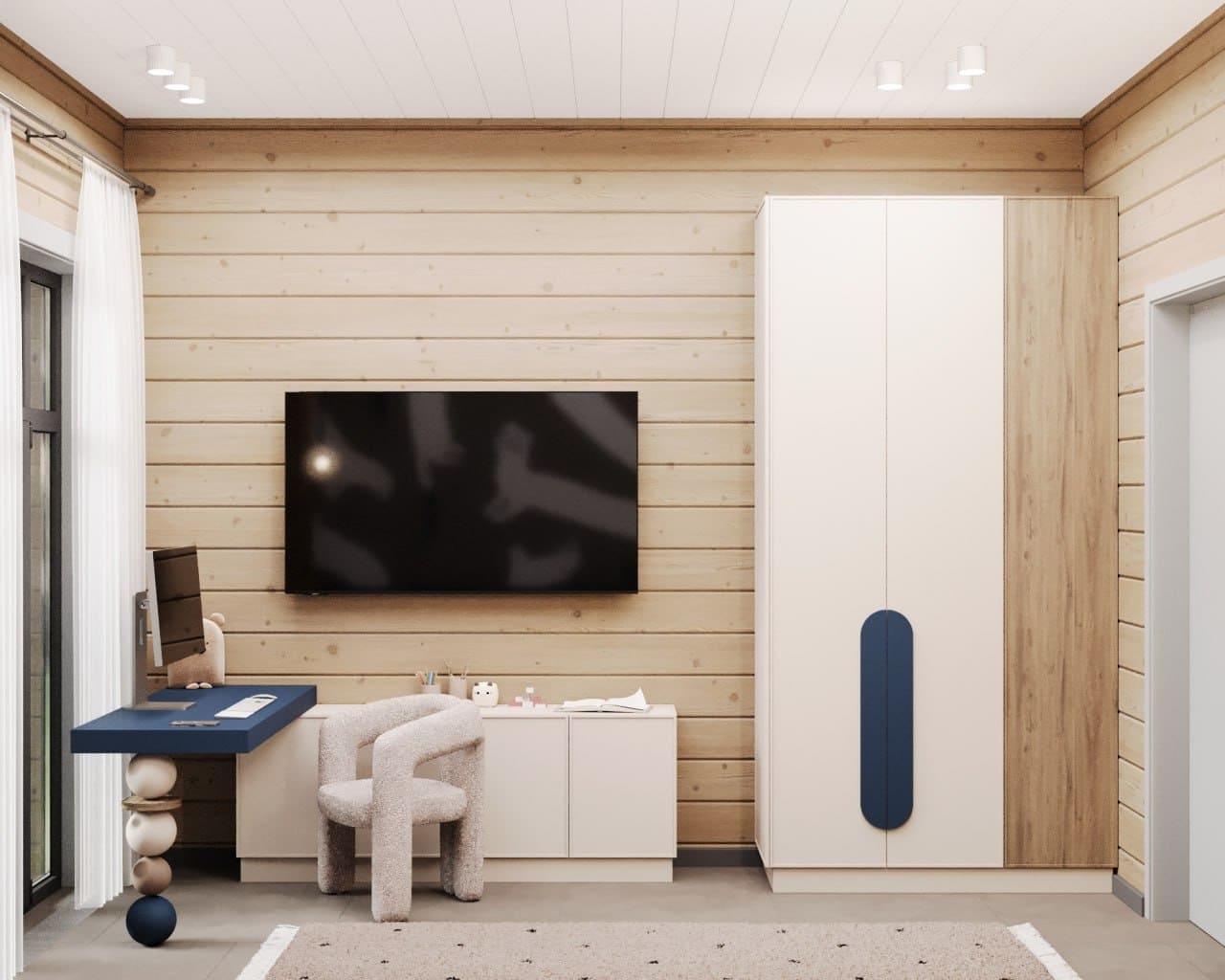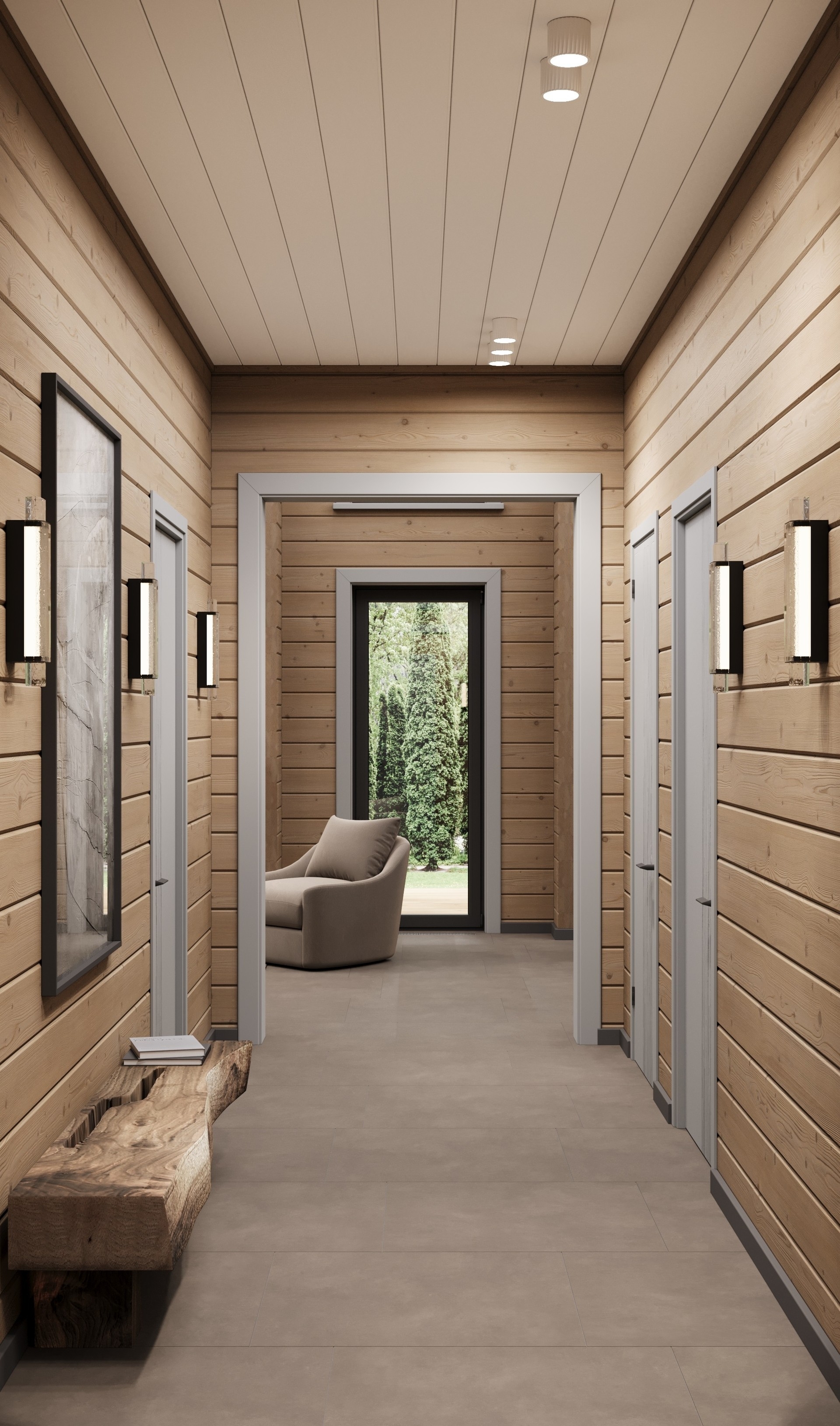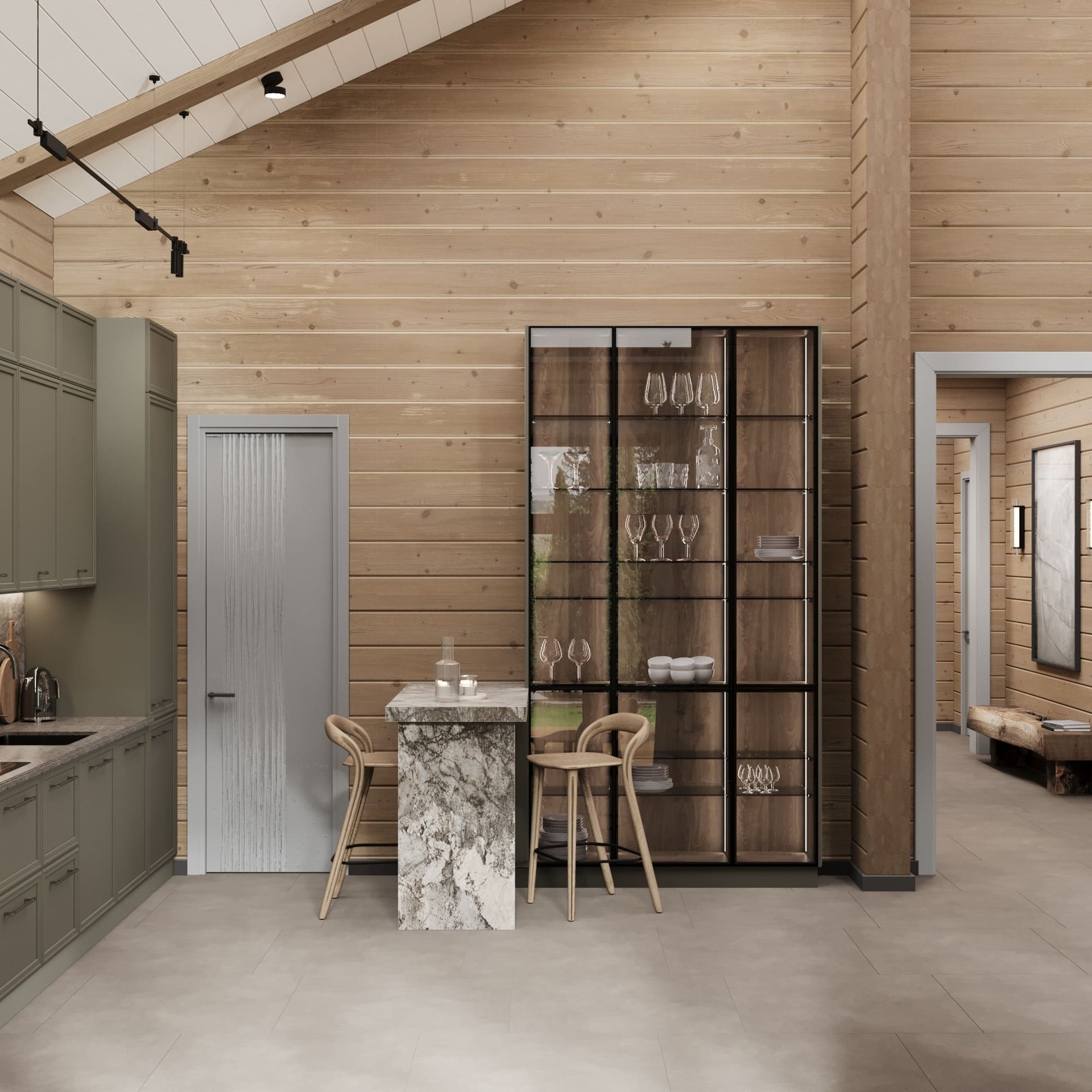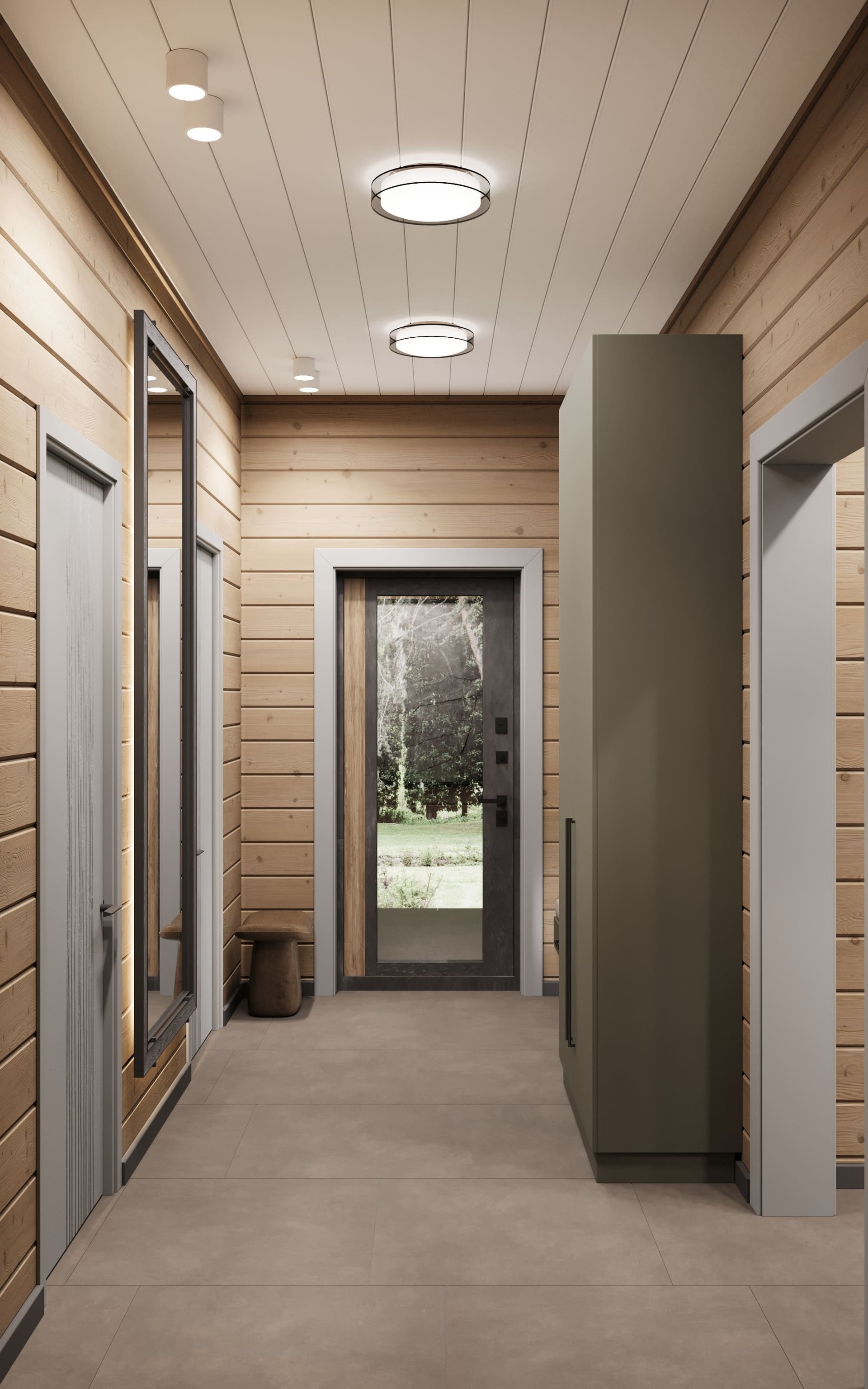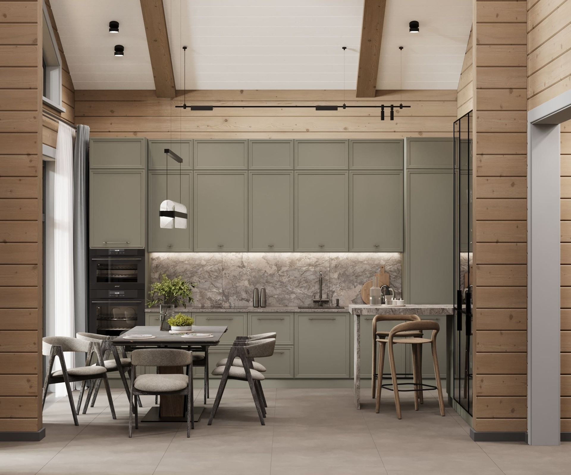 Ключевой принцип — лаконичность и естественность. Основу интерьера задаёт клеёный брус в натуральном цвете сосны: его теплота и текстура создают атмосферу уюта. Мы дополнили его фактурой алтайского камня с характерным блеском слюды и оттенками припылённой зелени — как лес у Катуни в утреннем тумане. Эти материалы не просто украшают пространство: они связывают дом с местностью, подчёркивая его локальную идентичность.