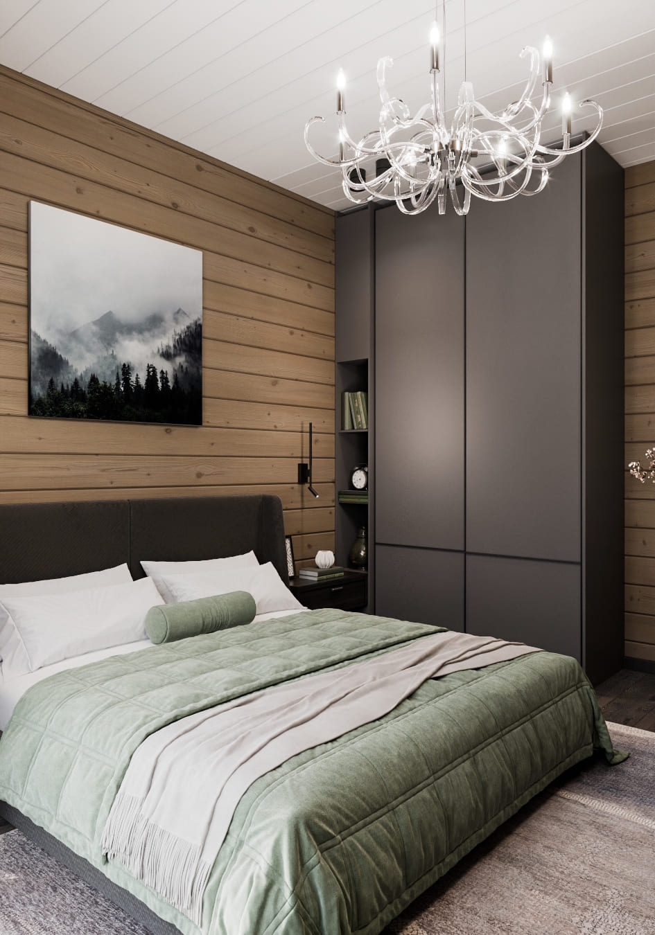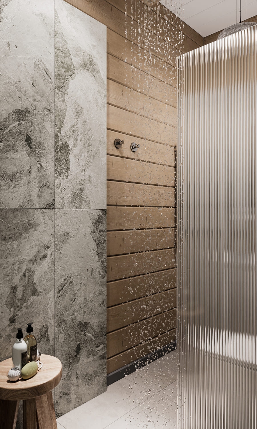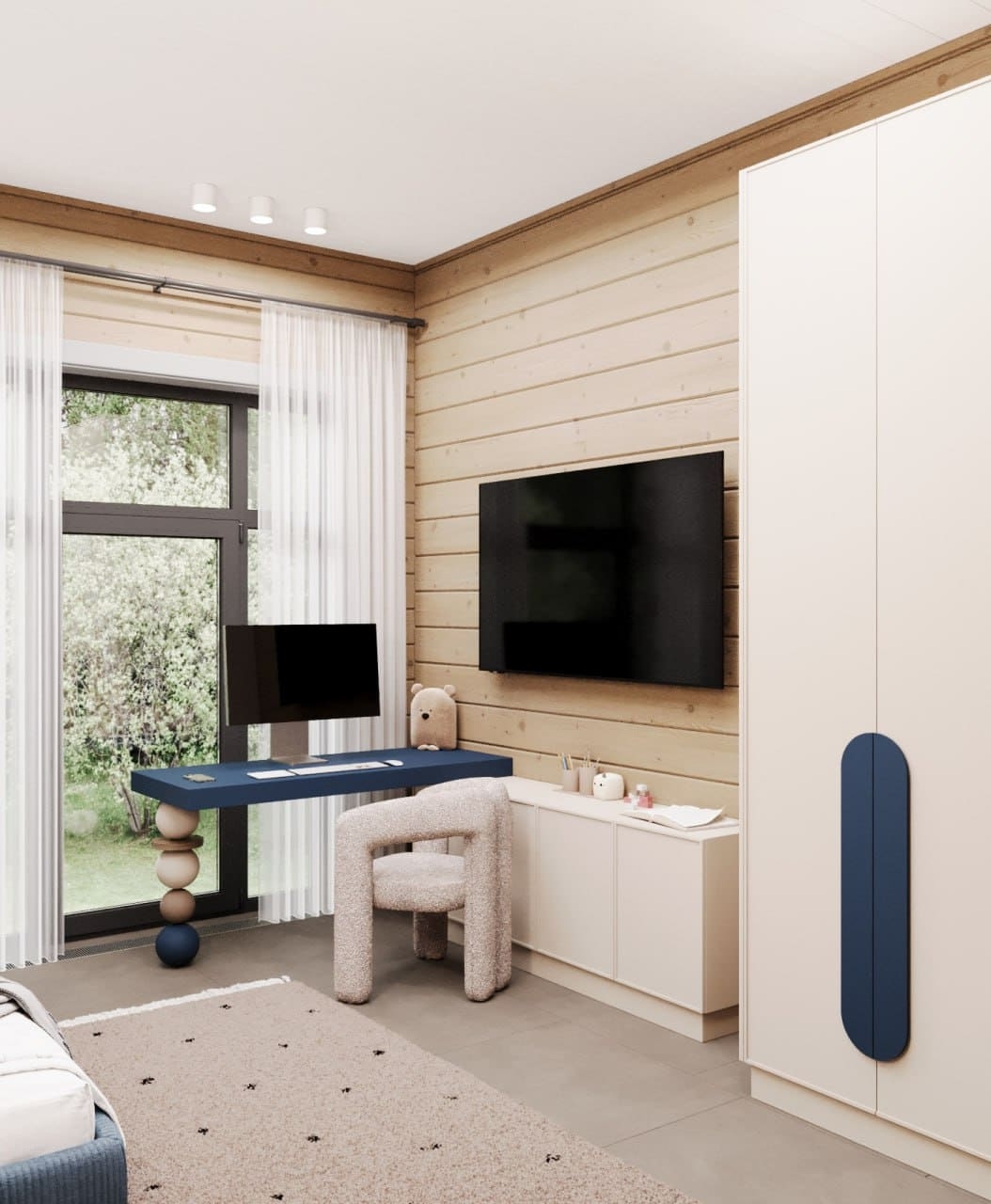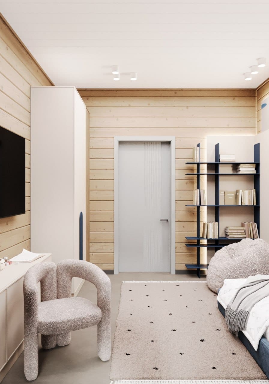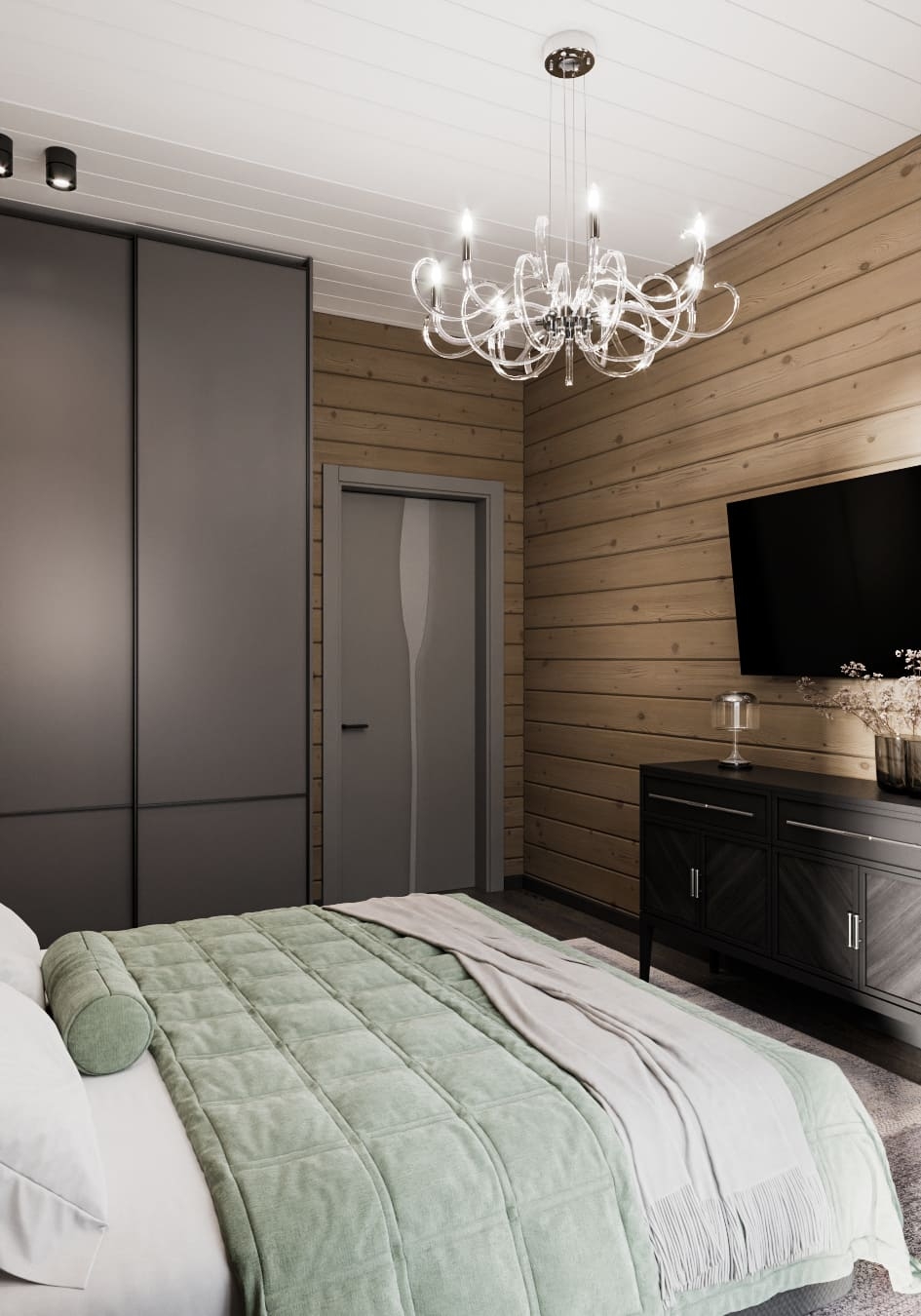 Ключевой принцип — лаконичность и естественность. Основу интерьера задаёт клеёный брус в натуральном цвете сосны: его теплота и текстура создают атмосферу уюта. Мы дополнили его фактурой алтайского камня с характерным блеском слюды и оттенками припылённой зелени — как лес у Катуни в утреннем тумане. Эти материалы не просто украшают пространство: они связывают дом с местностью, подчёркивая его локальную идентичность.
