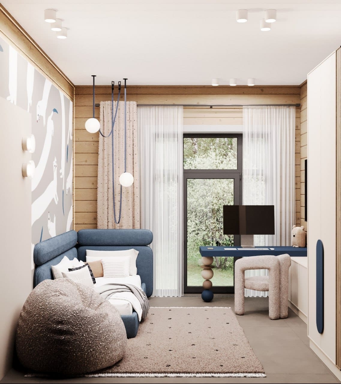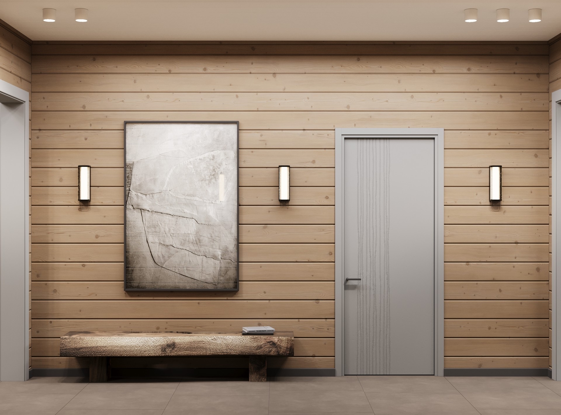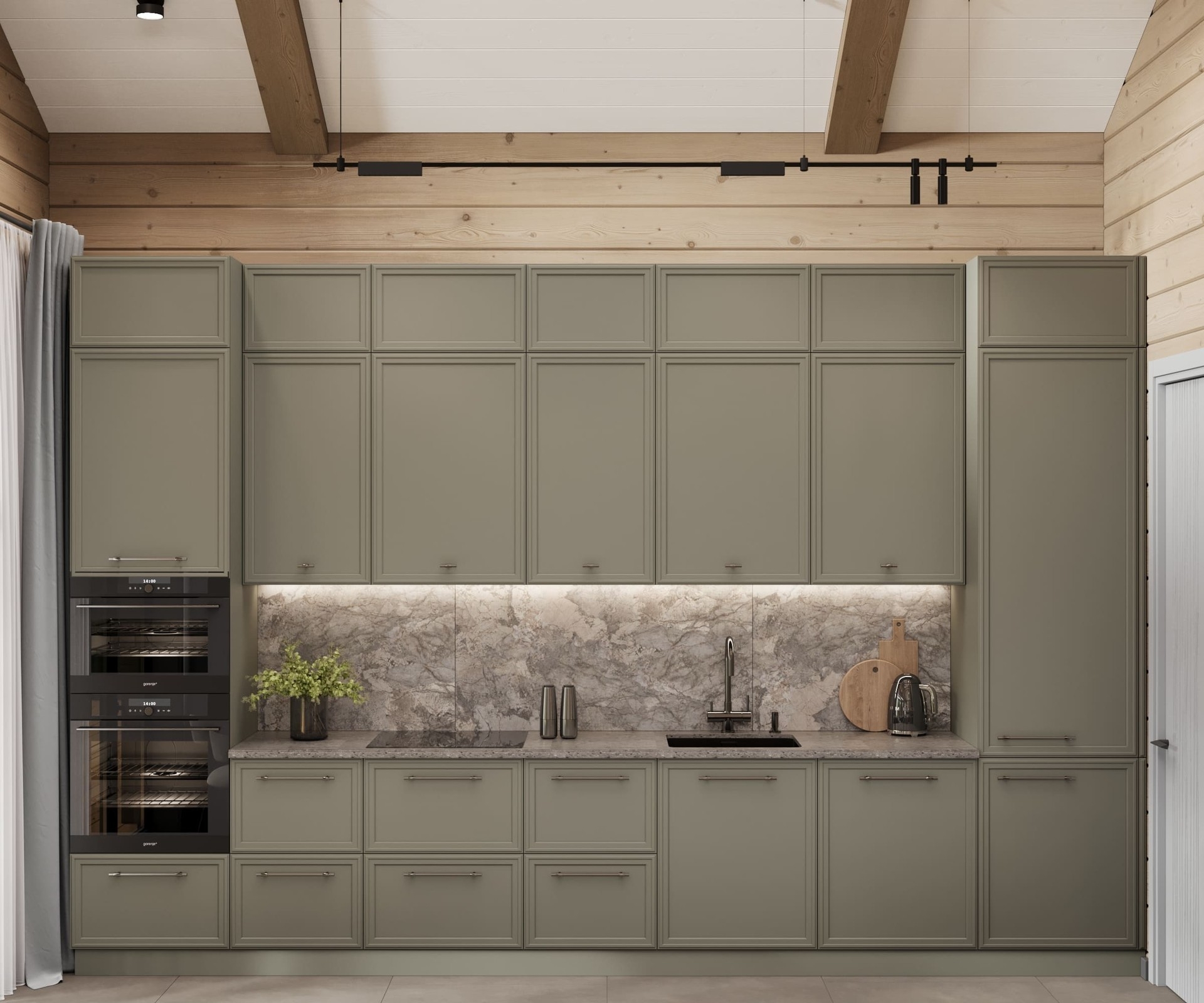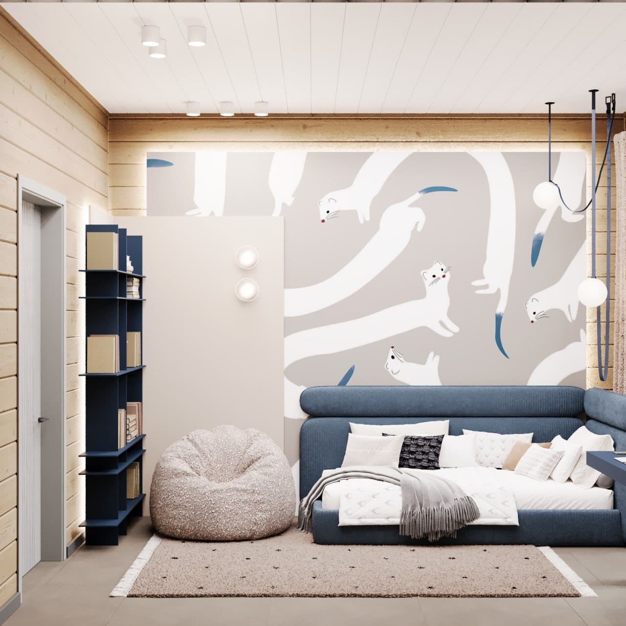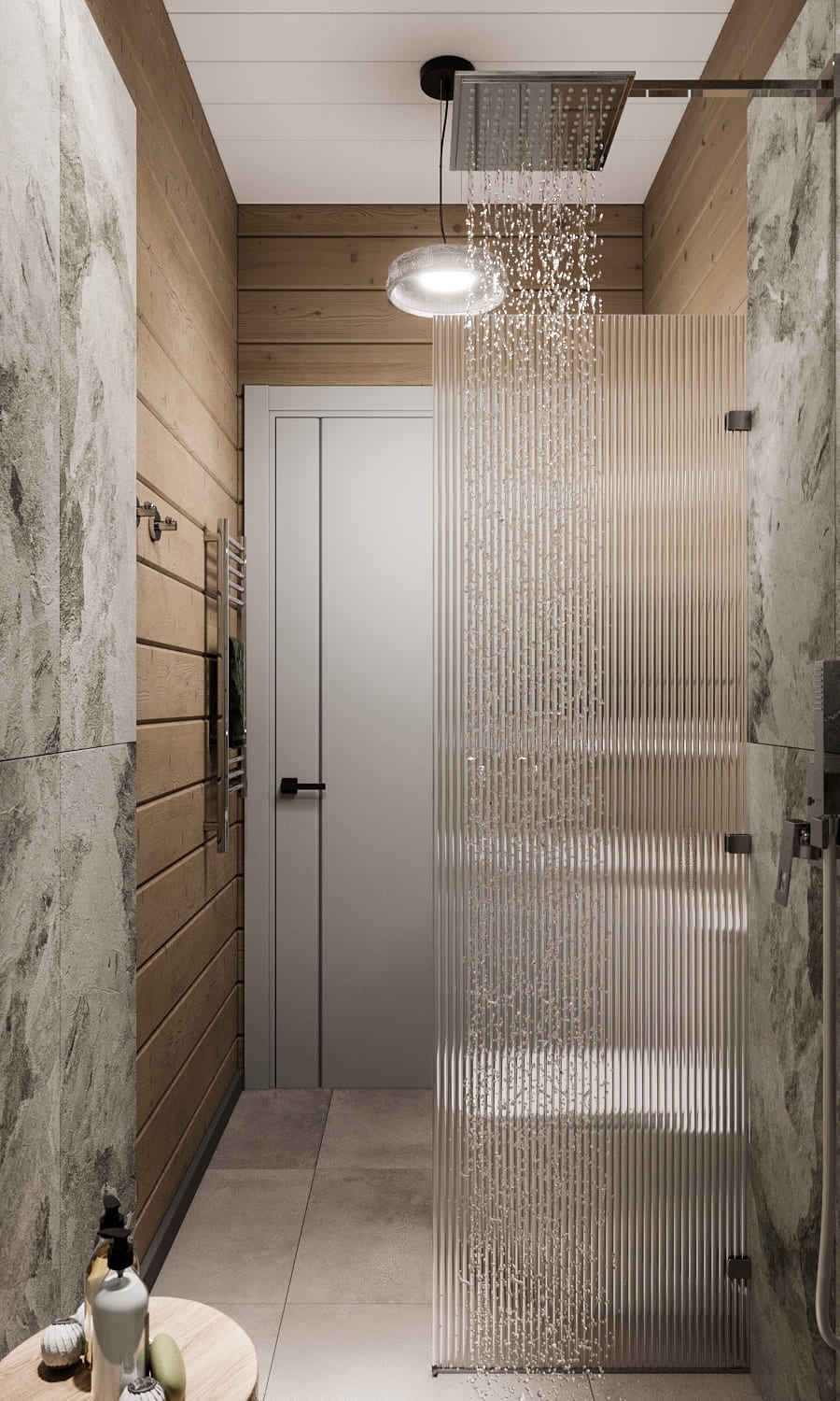 Ключевой принцип — лаконичность и естественность. Основу интерьера задаёт клеёный брус в натуральном цвете сосны: его теплота и текстура создают атмосферу уюта. Мы дополнили его фактурой алтайского камня с характерным блеском слюды и оттенками припылённой зелени — как лес у Катуни в утреннем тумане. Эти материалы не просто украшают пространство: они связывают дом с местностью, подчёркивая его локальную идентичность.