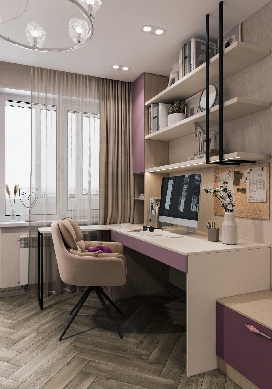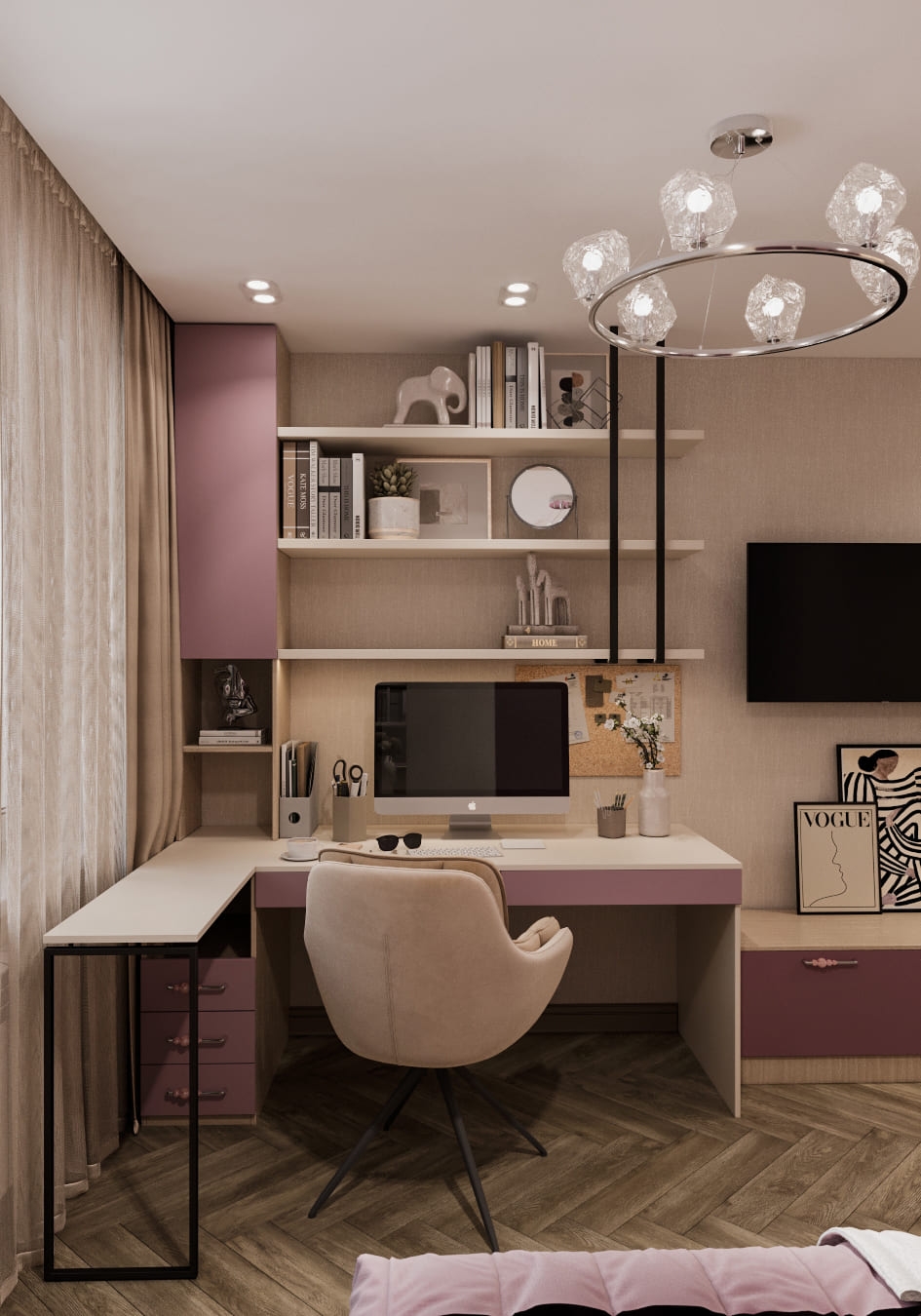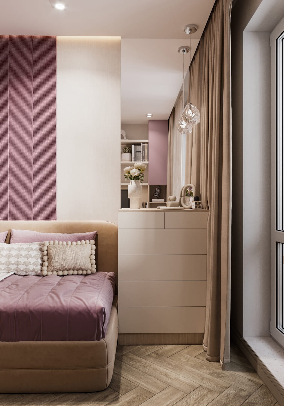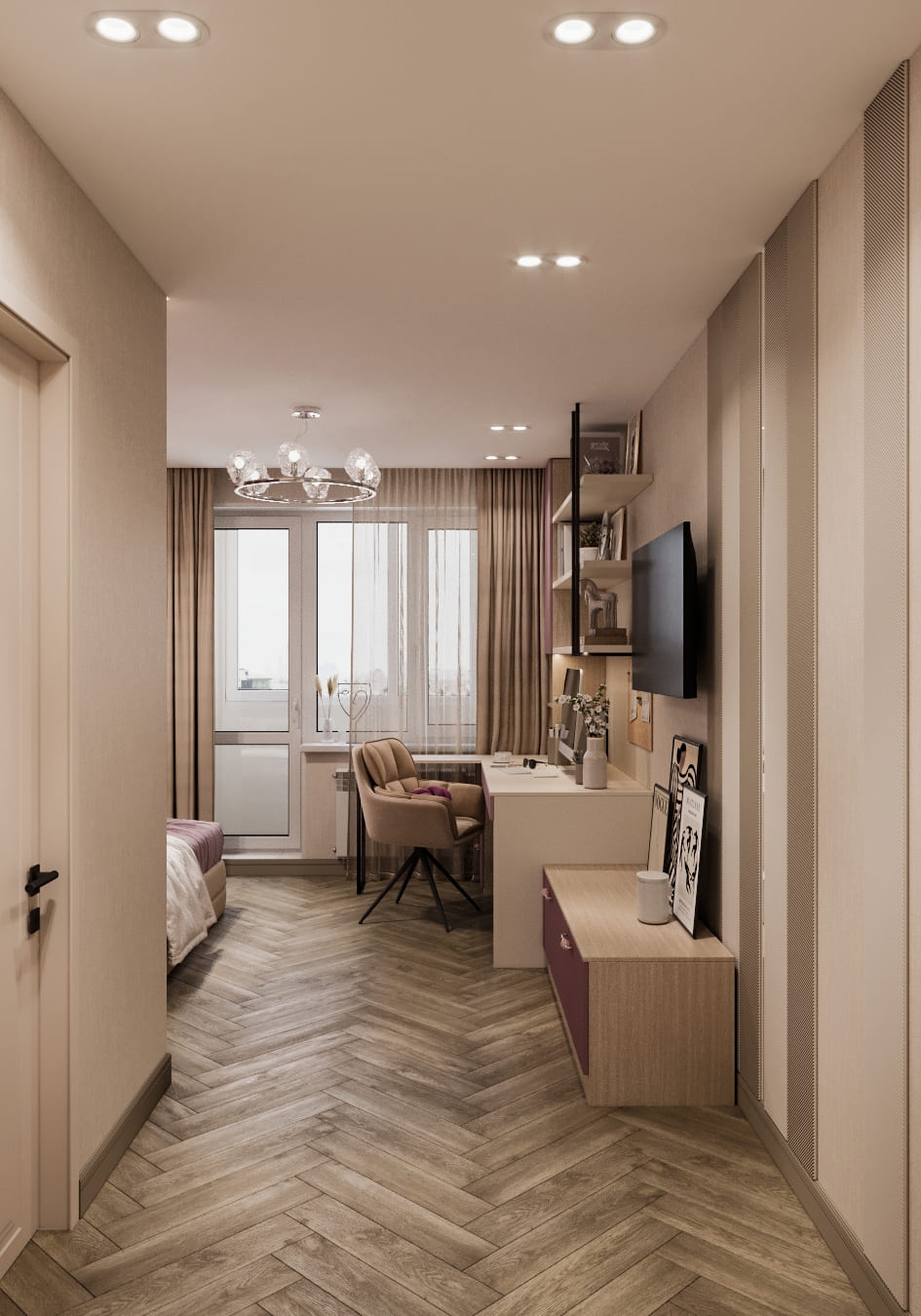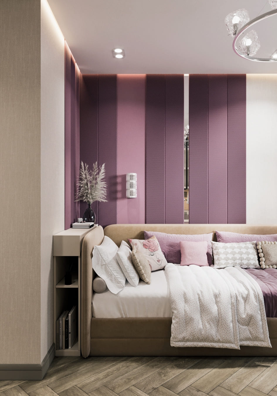 Особое внимание мы уделили девичьей комнате — самому просторному помещению в квартире. Изначально розовый цвет вызывал у родителей опасения, но после просмотра визуализации всё изменилось: мягкий оттенок гармонично вписался в общую концепцию, добавив интерьеру нежности и теплоты. В итоге получилась уютная и стильная комната — идеальное пространство для юной хозяйки, где есть место и учёбе, и отдыху.